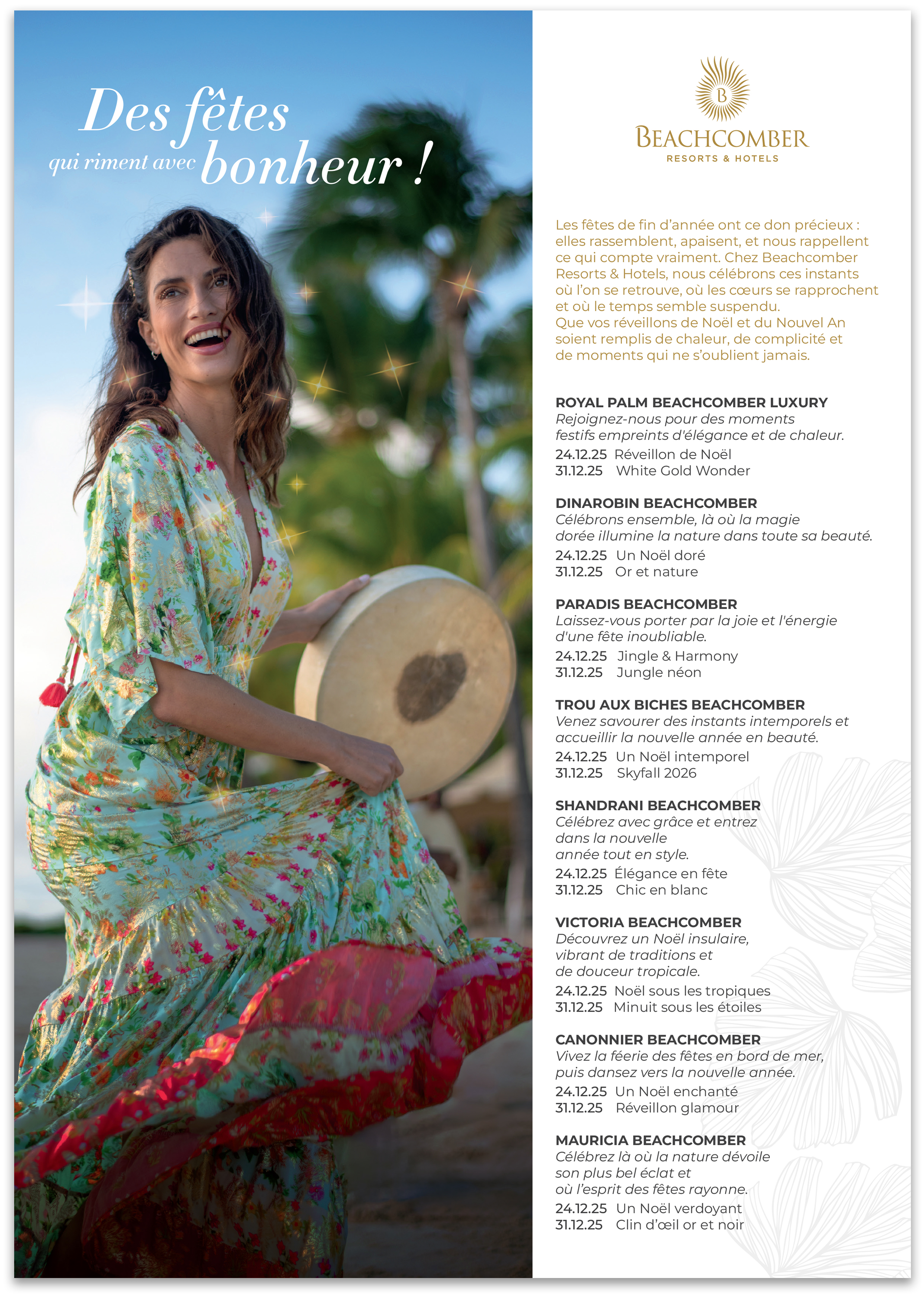 Avec Beachcomber pour vos fêtes de fin d'année, vous allez être surpris ! Des soirées thématiques, des décorations spectaculaires et des expériences culinaires exceptionnelles... il y aura de quoi ravir petits et grands et créer des moments de complicité avec vos proches. Que vous voyagiez en couple, en famille ou entre amis, Beachcomber saura répondre à vos attentes et faire de vos vacances un moment magique.
